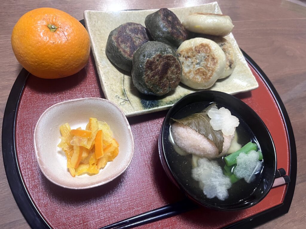 蒸したもち米を乾燥させて作る道明寺粉の生地と白身魚を合わせた汁もので、桜の葉の塩漬けのよい香りがします。