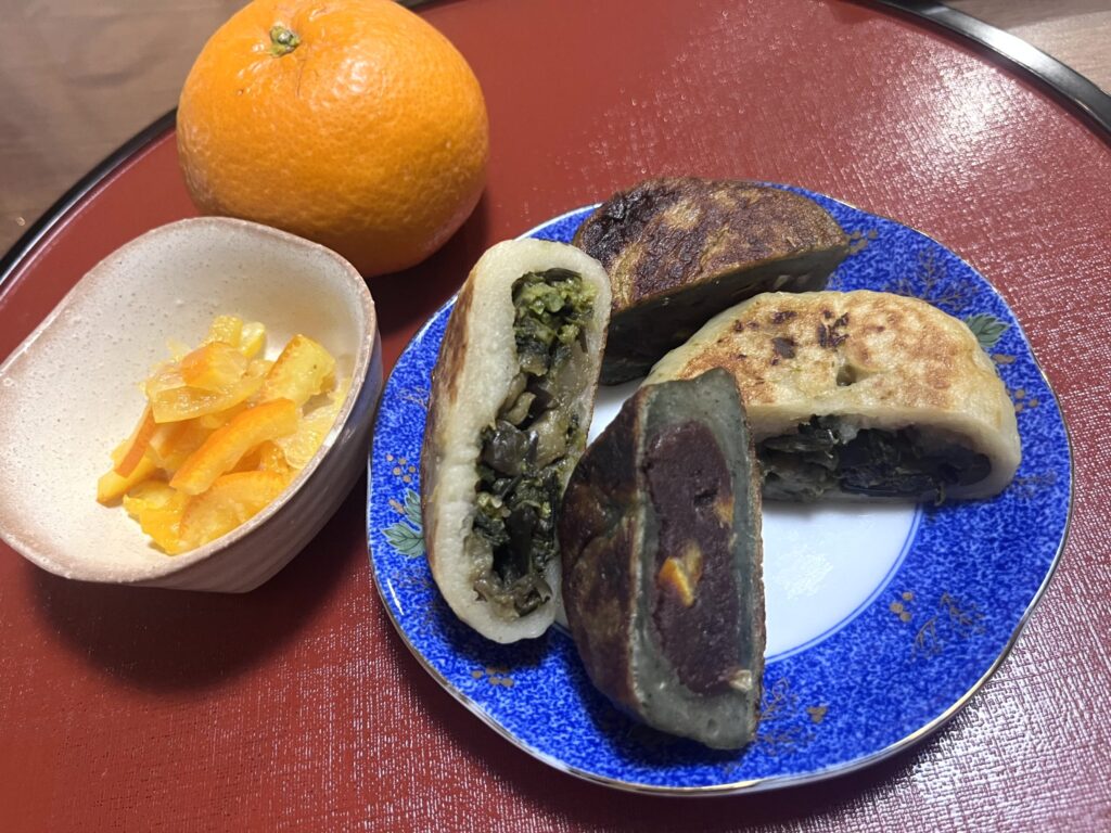 *プレーン生地の中は、なばなとナスの甘辛味噌炒め。
